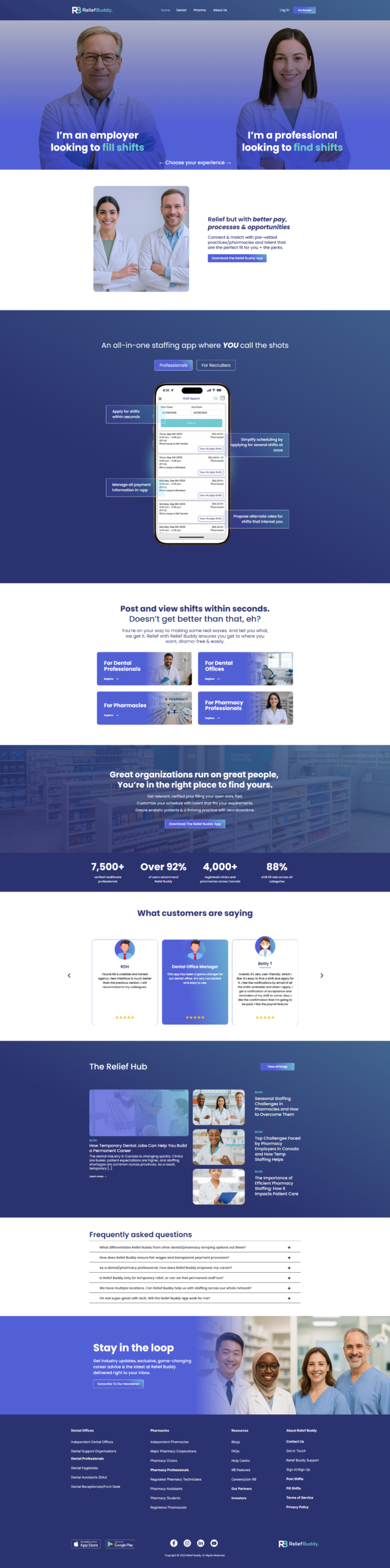 Relief Buddy is a next-generation healthcare staffing platform created to bridge the gap between dental offices, pharmacies, and pre-vetted healthcare professionals through a fast, flexible, and transparent mobile-first experience. The platform is designed to eliminate traditional staffing challenges by enabling clinics and pharmacies to post shifts, review qualified professionals, and confirm placements within minutes.