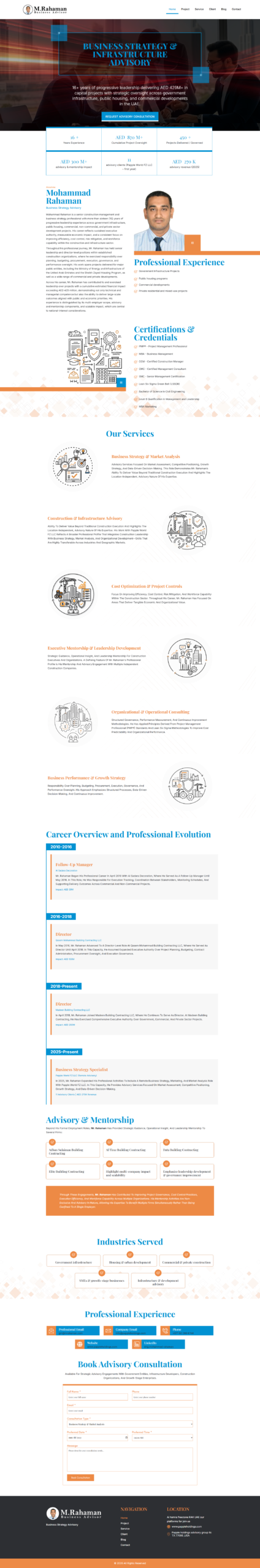 Mohammad Rahaman provides expert business strategy, operational insight, and leadership mentorship to multiple construction organizations, including government infrastructure, public housing, and commercial projects in the UAE. His advisory approach focuses on project governance, cost control, execution efficiency, and workforce capability, delivering measurable economic and organizational impact across diverse sectors.