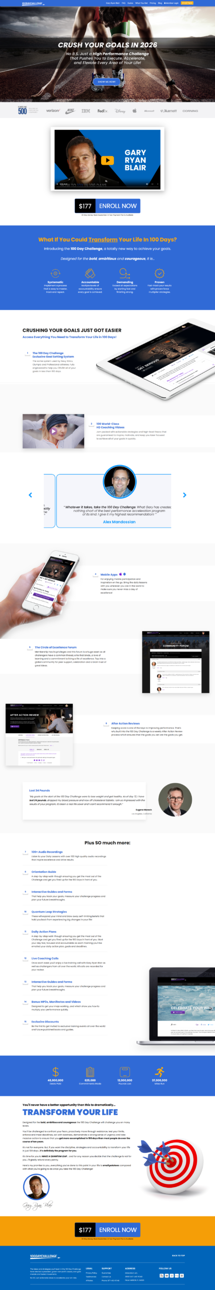 The 100 Day Challenge® is a revolutionary goal achievement system designed to help ambitious individuals transform their lives in just 100 days. Developed by Gary Ryan Blair, this program combines proven strategies used by Navy SEALs, Olympic athletes, and top performers to deliver rapid, measurable results. Through a structured and systematic approach, participants learn how to set clear goals, track progress, and stay accountable while building the discipline needed to succeed in any area of life.