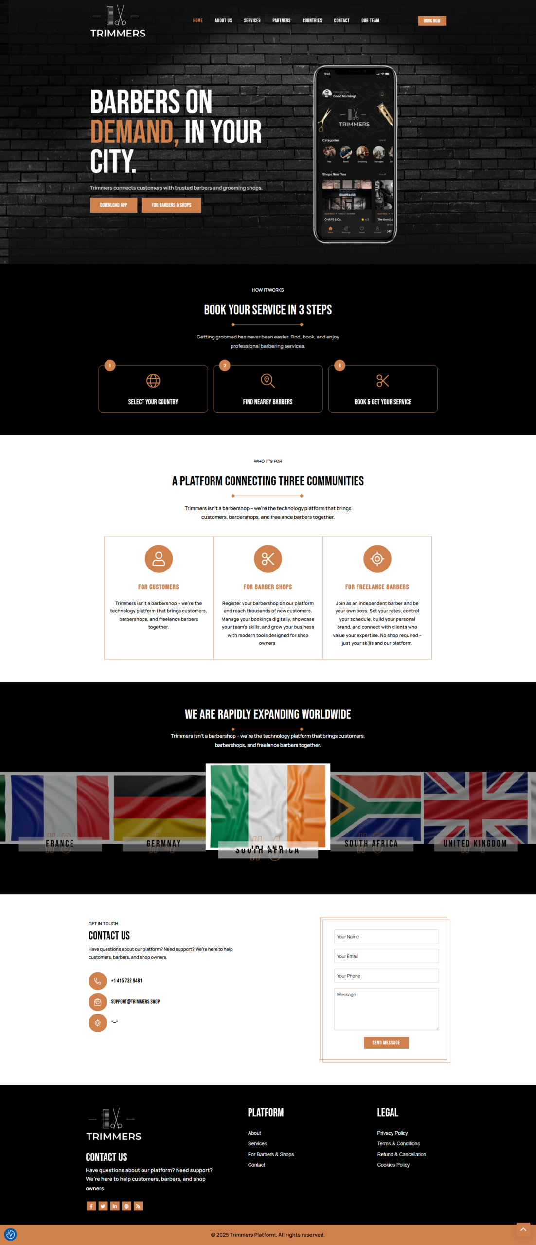 Trimmers is a modern on-demand grooming platform designed to connect customers with trusted barbers, barbershops, and freelance professionals across multiple countries. The platform focuses on convenience, reliability, and accessibility, allowing users to find nearby barbers, book services instantly, and enjoy professional grooming experiences. Trimmers also empowers barbers and shop owners with digital tools to manage bookings, grow visibility, and scale their businesses efficiently.